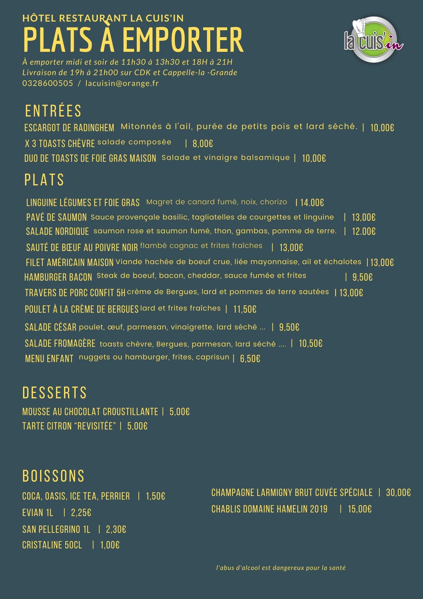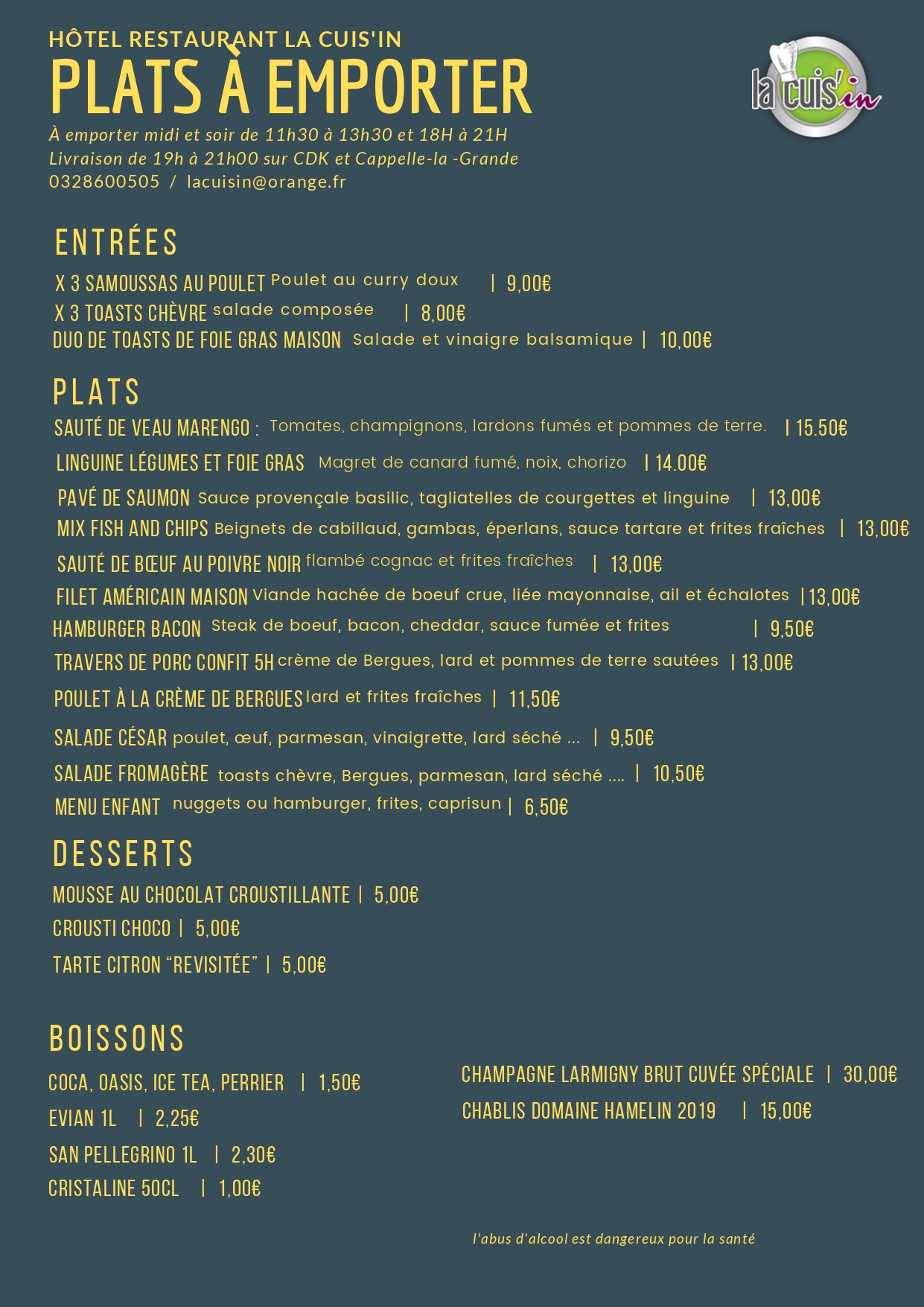 Découvrez notre menu de plats à emporter et passez commande en appelant le 03/28/60/05/05 ou en nous envoyant un e-mail à lacuisin@orange.fr. Les retraits de commandes sont disponibles de 11h30 à 13h30 et de 18h00 à 21h00.